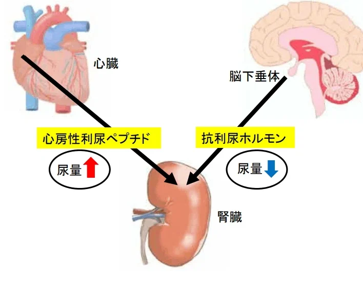 このとき、心臓に負担がかかり、体内で利尿を促すホルモン(心房性ナトリウム利尿ペプチド)が分泌されます。