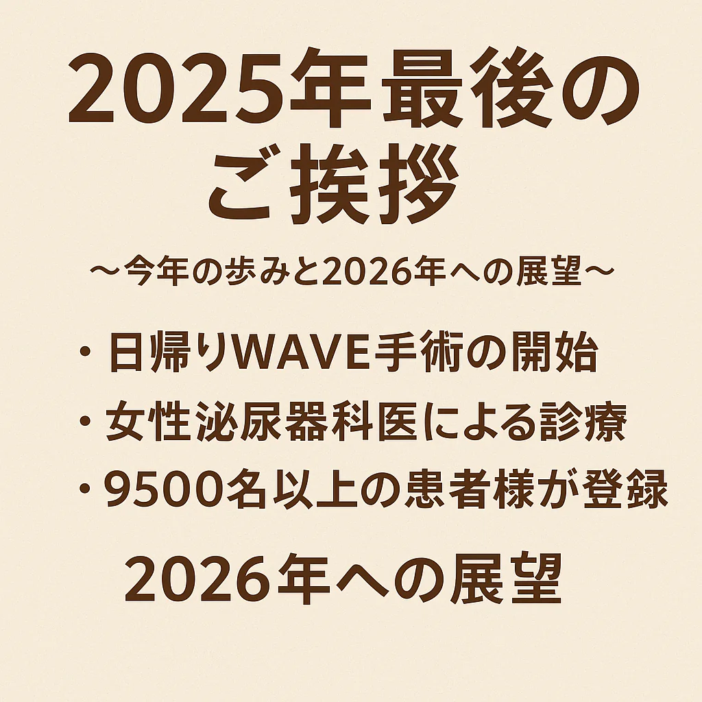 2025年年初より準備を重ね、同年5月より前立腺肥大症に対する 日帰りWAVE手術(経尿道的水蒸気治療) を開始しました。WAVE手術は、2022年より保険適応となった前立腺肥大症に対する低侵襲手術であり、前立腺組織を水蒸気で縮小することで排尿障害の改善が期待できる治療 です。