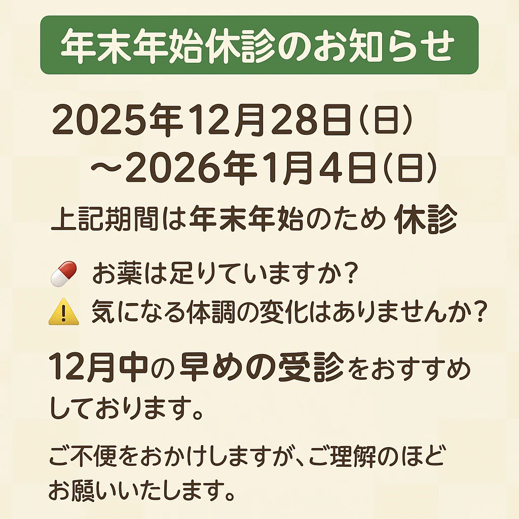 誠に勝手ながら、【2025年12月28日(日)~2026年1月4日(日)】まで、年末年始休診とさせていただきます。